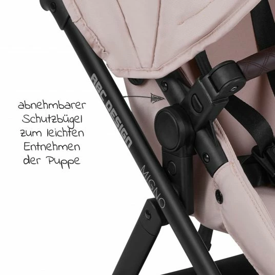 Wie von den „erwachsenen“ ABC Design Kinderwagen-Modellen gewohnt, steckst Du die Babywanne einfach mit einem Klick auf das schicke Gestell. Sobald das Puppenkind größer ist, wird die Babywanne mit wenigen Handgriffen zum Sportsitz umgebaut. Für eine sichere Fahrt sorgt das 5-Punkt-Gurtsystem. Der Schutzbügel des Puppenwagens lässt sich einfach abnehmen.