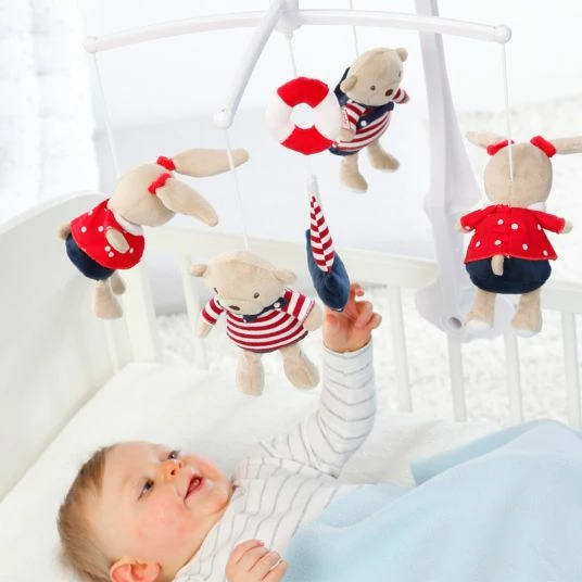 On the right steamer, you’re on the sweet Mobile Ocean Club music from Baby Fehn. The characters turn slowly to music and lead your baby gently into the land of dreams. Simply attached to the crib, the mobile gives your darling first visual stimuli and makes him curious about his surroundings. You can remove the individual figures and wash them conveniently in the machine.