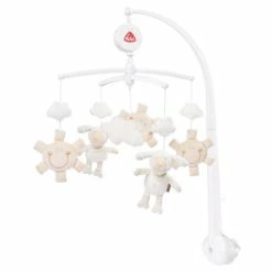 This sweet Music-Mobile Baby Love by Baby Fehn is the ideal sleeping companion for the little ones. The music box turns slowly in a circle and the sweet sheep dance to the sleep music. The melody of the lullaby calms your baby and gently lulls him to sleep. The high-quality and soft material is pleasant to feel and to grasp, the different colours arouse the attention of your child.