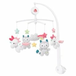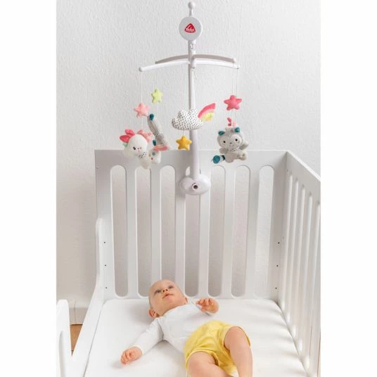 Das Musik-Mobile Aiko & Yuki von Baby Fehn wird Babyaugen zum Leuchten bringen: Die kleinen EinhΓΆrner und Katzen sorgen tagsΓΌber fΓΌr SpielspaΓ und sind abends treue Einschlafhelfer. Die knalligen Farben und interessanten Strukturen fesseln die Aufmerksamkeit des Babys und erwecken die Fantasie. Die beliebte Melodie Schlafe mein Prinzchen der mechanischen Spieluhr lΓ€sst die Figuren tanzen und regt das Baby zum Lauschen an: In ruhigen Minuten lΓ€sst sie sich dank des An/Aus-Schalters abstellen. Das Mobile wird ganz einfach am Babybett befestigt und ist damit ein sΓΌΓer Hingucker im Kinderzimmer!