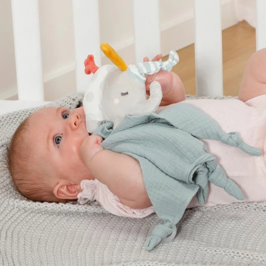 Für die kleinen Kinderhände ist der stoffliche Beschützer sehr gut zu greifen und festzuhalten. Das blaue Tuch mit niedlichem Elefant ist außerdem ein ganz toller Zuhörer und kann auch nachts als Einschlafbeschleuniger oder im Kindergarten zum Kuscheln und Knuddeln bei Deinem Baby bleiben. Wird der Schmusefreund einmal schmutzig, kannst Du ihn mit einer Maschinenwäsche bei 30°C reinigen.