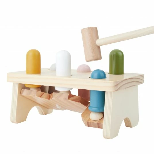 Die Bank ist mit 6 Holzstiften ausgestattet, die mit Hilfe eines kleinen Hammers durch die Lochungen geklopft werden. Dadurch wird die Auge-Hand-Koordination gefördert, so dass mit etwas Geschick und Übung immer genauer getroffen wird. Wird ein Stift herunter geklopft, springt der ihm gegenüberliegende Stift nach oben. So erkennt Dein kleiner Weltentdecker schnell Bewegungszusammenhänge.