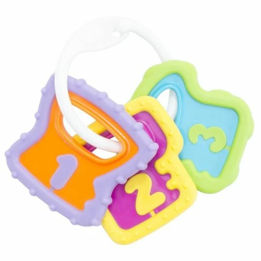Der kunterbunte Greifling Schlüsselbund von Chicco ist ein toller Spielfreund für Ihr Baby. Der leichte Greifling ist mit drei bunten Zahlenanhänger versehen, die fröhlich klappern, wenn Ihr Kind sie schüttelt. Unterschiedliche Strukturen darauf fördern gleichzeitig spielerisch den Tastsinn. Und damit Ihr Kleines den Schlüsselbund immer bei sich haben kann, befestigen Sie ihn einfach mit Hilfe des Rings an der Babyschale oder dem Kinderwagen.
