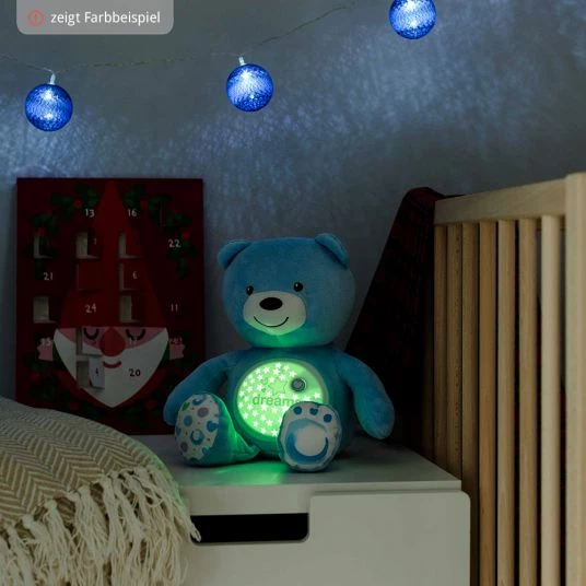 Das Kuscheltier mit Nachtlicht Baby Bär von Chicco sorgt dafür; dass Dein kleiner Schatz schnell und sanft einschläft. Die projezierten Sterne und die sanfte Musik strahlen eine besondere Ruhe aus. Die Lichteffekte können in 3 Stufen eingestellt werden – Sternenprojektion bei höchster Helligkeit, Relaxlicht mit bunten Lichtern bei mittlerer Helligkeit und Nachtlicht mit bunten Lichtern bei niedriger Helligkeit. 30 Minuten leuchtet und/oder spielt das Bärchen unterschiedliche Melodien, danach schaltet es sich automatisch ab. Der Teddybär ist aus weichem Plüsch und sein Bäuchlein aus weichem Kunststoff – so kann ausgiebig mit ihm gekuschelt uns geschmust werden. Außerdem ist er bis 30°C in der Maschine waschbar.