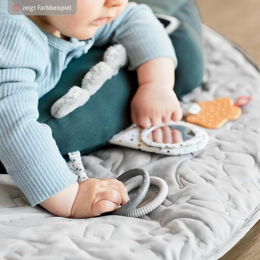 - Material: Stoff aus 100% Polyester, Füllung aus 100% Polyesterfasern & Quarzsand-Sack, Beißring aus 100% TPE, Ringe aus 100% PP