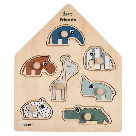Ob jung oder alt – puzzeln macht nicht nur viel Spaß sondern fördert auch unsere Denkprozesse. Das Steckpuzzle Deer Friends von Done by Deer eignet sich für Deinen Nachwuchs, abhängig von der Entwicklung, etwa zwischen dem 12. und 18. Lebensmonat. Die 7 niedlichen Puzzleteile mit seinen Zoobewohnern lassen sich dank kleinen Holzgriffen sehr gut von kleinen Kinderhänden greifen.