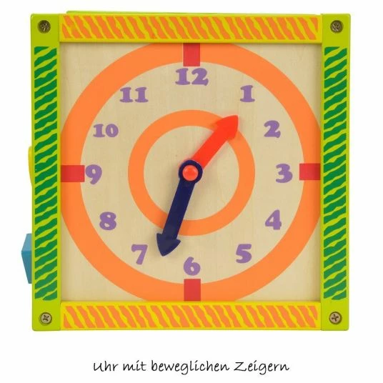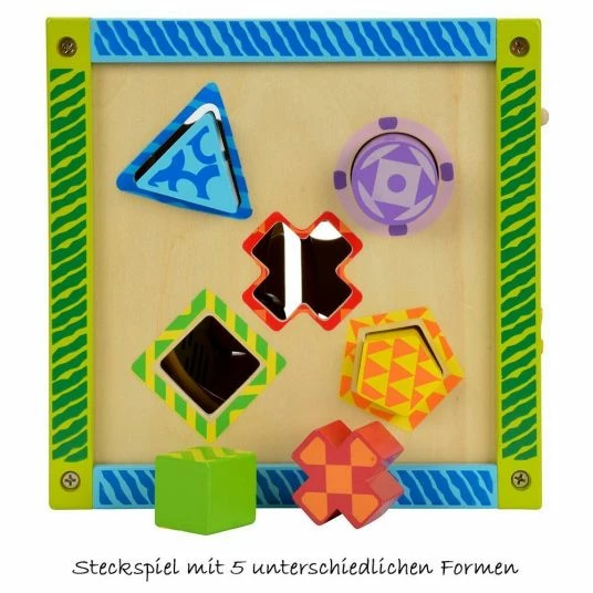 On 5 sides, children can train their visual perception, motor skills and dexterity by pushing the shapes over the motor loops or finding the matching insertion holes for the 5 colourful wooden blocks. There is also a labyrinth where 3 different shapes have to find the right way; a learning clock with movable hands and a rotating game with 3 funny wheels. The All in One cube promises excitement for children from the 12th month of life.
