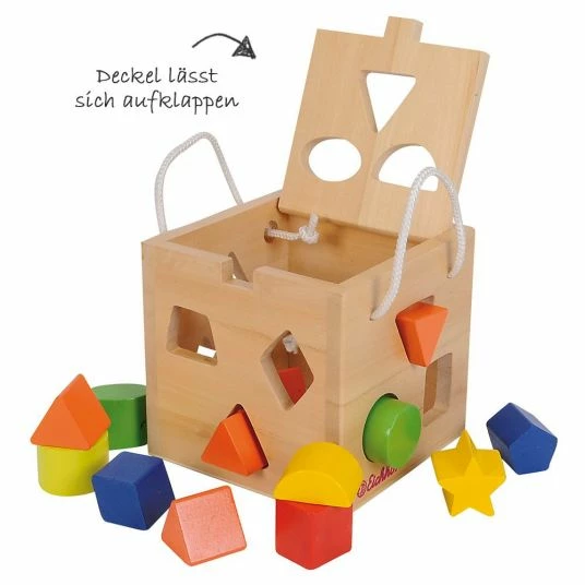 With the Steckwürfel from Eichhorn, your child will insert the appropriate shapes into the differently shaped openings. With some skill and patience the colored stones can be sorted. The dice can be opened on one side, so all twelve shapes can be taken out again and the game fun starts all over again. Due to the practical loops the cube can also be carried around easily.