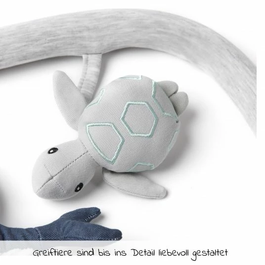Die kleinen Plรผschtiere mit natรผrlichen Farben und verschiedenen Materialien sowie Knisterfolie, Glรถckchen und leichtes Rasseln, laden zum Greifen und Fรผhlen ein. So unterstรผtzen die 3 Meeresbewohner die Hand-Auge-Koordination und sprechen alle Sinne Deines kleinen Entdeckers an. Der Abstand der Figuren zu Deinem Kind kann je nach Fรคhigkeiten und Interesse variiert werden.