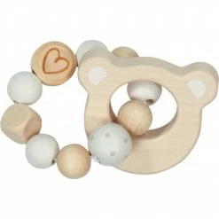 Der Elastik Greifling – Bärenkopf von Goki stimuliert die Sinne Deines Babys. Dank der zwei unterschiedlichen Formen – Perlen und Bärenkopf – wird der Tastsinn gefördert. Das Spielen, Anfassen und Drehen des Greiflings schult die Feinmotorik. Durch das Bewegen des Greiflings vor den Augen wird die Augen-Hand-Koordination Deines Kindes angeregt und erstes Greifen danach erlernt.