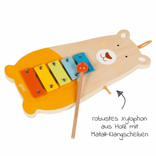 Als erstes Musikinstrument für Deinen kleinen Schatz ist das Goki Holz-Xylophon im niedlichen Bären-Design ideal geeignet: Lässt er die Klänge der 5 Plättchen mit Hilfe des Schlegels erklingen, macht das nicht nur sehr viel Spaß, sondern schult auch das Gehör. Auf diese Weise weckt das bunte Musikinstrument die Begeisterung Deines Kindes für Rhythmus und Klang. Dazu muss der kleine Musikant keinerlei Noten beherrschen, denn die Farben machen das Musizieren besonders einfach.