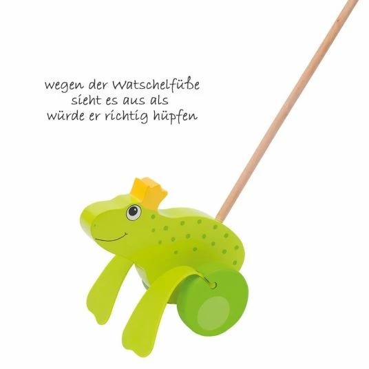 Das Schiebetier Froschkönig mit Watschelfüßen von Goki ist der ideale Begleiter bei den ersten Schritten und animiert Ihr Kind zum selbstständigen Laufen. Durch die Gummischlappen sieht es aus als würde der Frosch vorne weg hüpfen. Alle Formen sind weich abgerundet, sodass für ein kindgerechtes Spielerlebnis gesorgt ist.