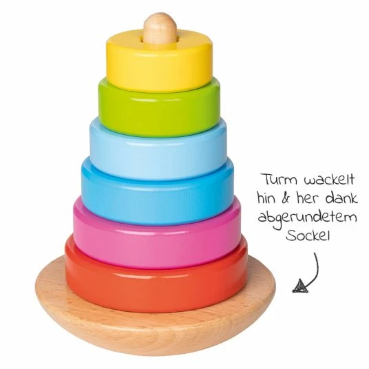 Der schaukelnde Stapelturm von goki bietet mit seinen 6 bunten Ringen eine Menge Stapelspaß. Ob von Groß zu Klein, von Klein zu Groß oder wild durcheinander – Dein Schatz wird jede Menge spaß haben die Ringe auf den wackelnden Turm zu stecken. Dabei wird spielerisch die Koordination und Geschicklichkeit Deines Schatzes trainiert.