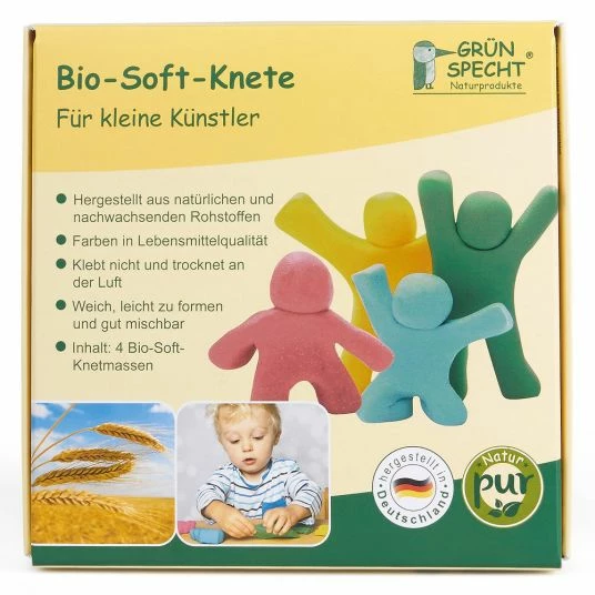 Bio-Soft-Knete von Grünspecht kann Dein Kleines ab 2 Jahren seine feinmotorischen Fähigkeiten weiterentwickeln und Personen, lustige Tiere oder verschiedene Figuren formen. Der Kreativität sind dabei keine Grenzen gesetzt.