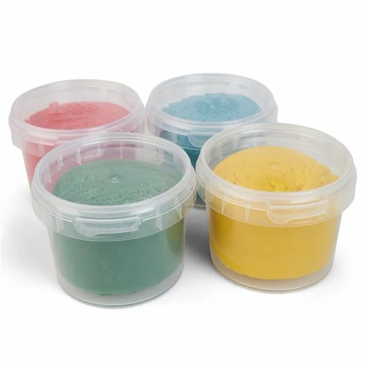 4 Becher mit Grünspecht Bio Soft-Knete in den Farben Rot, Grün, Blau und Gelb