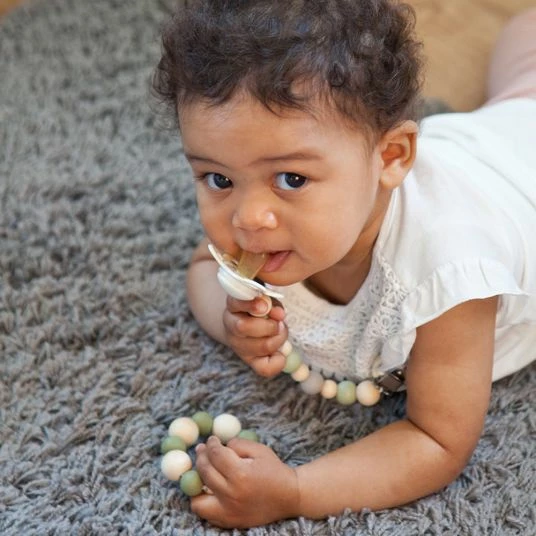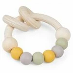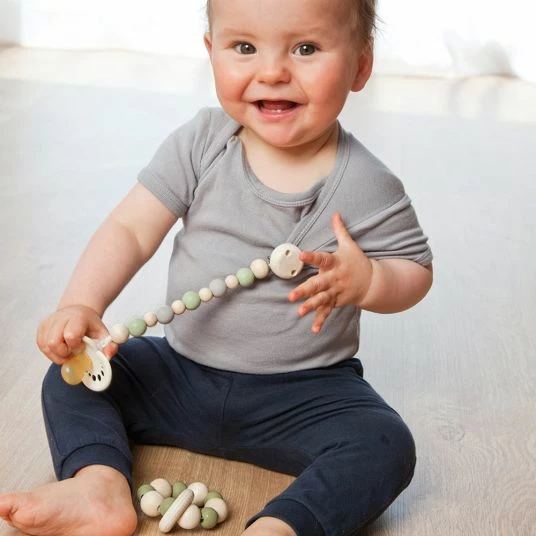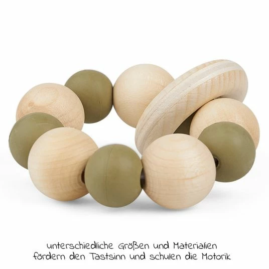 Die interessanten Farben der Naturkautschuk-Perlen laden zum Erkunden und Betrachten ein. Unterschiedliche Formen und verschiedene Materialbeschaffenheiten motivieren zum Fühlen und Tasten. Ist Dein Liebling gerade in der Zahnungsphase, wird der Ring gerne zum Beißen genutzt, um das schmerzende Zahnfleisch zu massieren.