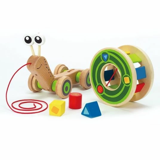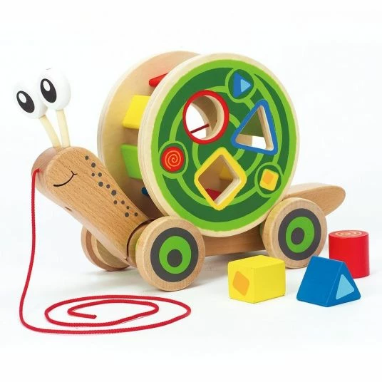 The funny trailer animal snail from Hape is with its grading function a great companion and play friend for your child. The colourful snail shell hides wooden blocks that can be transported wonderfully inside. To play, the snail shell can be removed and transformed into a shape sorter. Now your child can look for the appropriate openings for the colourful wooden forms. In this way the coordination, fine motor skills and concentration of your child are promoted in a playful way. On the back of the sorting game a rubber band prevents the stones from falling out. However, your child can easily remove the blocks again. The sweet snail can be pulled along the string by your child with or without a snail shell.