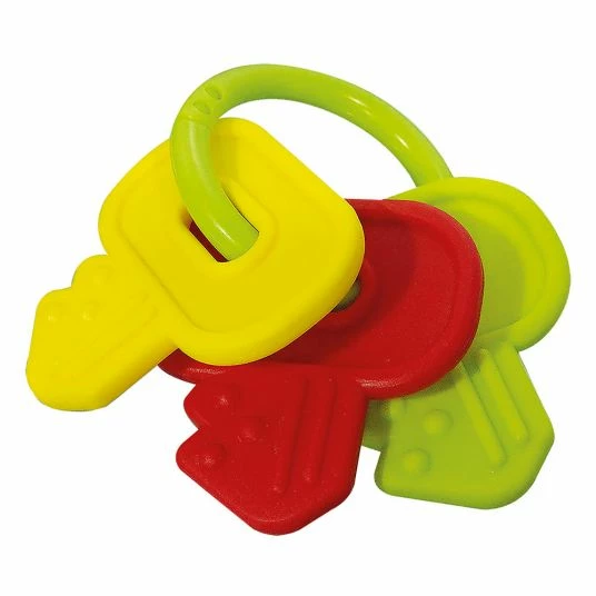 Die bunten Beißschlüssel von Happy People bringen Spielspaß nach Hause. Schon in den ersten Wochen können Babys den Ring und das leichte Material sicher greifen. Bei jeder Bewegung klappern die Schlüssel aneinander und wecken so die Neugier und Aufmerksamkeit. Die bunten und unterschiedlichen Farben regen zudem die visuelle Wahrnehmung Deines Babys an. Nebenbei wird der Tastsinn und die Motorik auf spielrische Weise trainert. Alle 3 Schlüssel sind an einem Ring zu einem Schlüsselbund miteinander verdunden, so kann keiner verloren gehen.