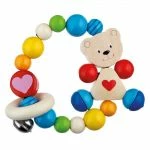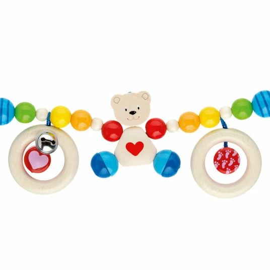 With the Kinderwagenkette HerzbΓ€r from Heimess your baby will never be bored on a ride. The colourful necklace with its different shapes, colours and sizes is a perfect place to grab and discover. A little lucky girl will ring the doorbell for you and speak to your child’s sense of smell. The colorful wooden elements have different structures and shapes that your child wants to experience and explore. The two large untreated wooden rings are easy to grip and turn. The pram chain is simply attached to the pram or the top of the infant carrier with the two clips.