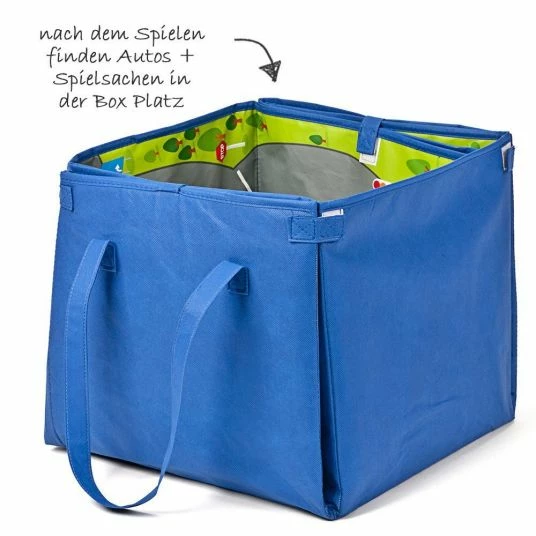 Mit dem praktischen 2in1 Spielteppich und Aufbewahrungs-Box Minimobil Traffic von Miniland kann Ihr Kind toll spielen und anschlieรend alle Spielsachen darin verstauen. Der 100 x 100 cm groรe und robuste Spielteppich ist mit Straรen und Orten bedruckt, die Ihr Kind bereits aus seiner Umwelt kennt. Hier kรถnnen alltรคgliche Situationen wunderbar mit Spielzeugautos und -figuren nachgestellt werden. Nach dem Spielen kann der Teppich zu einer praktischen Aufbewahrungsbox mit Tragehenkeln umgebaut werden. Hierzu werden die Seiten aufgestellt, eingeklappt und mit Klettverschlรผssen befestigt. Schon finden die Spielsachen in der Box ausreichend Platz und sind im Handumdrehen aufgerรคumt. Sie kรถnnen den Teppich auch flach zusammenklappen und platzsparend verstauen oder transportieren. Die Spieloberflรคche lรคsst sich problemlos mit einem feuchten Tuch abwischen.