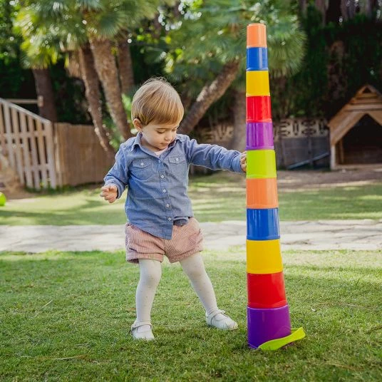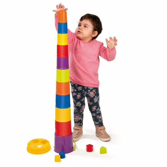 Der Stapelturm Gianttemit Steckspiel von Miniland hält gleich zwei tolle Spiele für Dein Kind bereit. Die 10 bunten Becher lassen sich mit dem Henkeleimer zu einem 95 cm hohen Turm stapeln. Der große Eimer lässt sich aber mit dem enthaltenen Aufsatz auch zu einem tollen Steckspiel umfunktionieren. Dazu beinhaltet das Spielzeug noch 4 unterschiedliche Förmchen, die richtig zugeordnet werden müssen. Doch die Förmchen halten noch eine weitere Überraschung parat: dank kleiner Löcher im Boden, können sie auch prima als Sand- und Wasserspielzeug verwendet werden. Durch die Löchlein rieselt fein der Sand und tropft Wasser wie Regen heraus. Alle Becher und Förmchen können im Inneren des großen Eimers mit Henkel platzsparend verstaut und transportiert werden. Somit ist Giantte auch ideal für den Spielplatz und Strand geeignet.