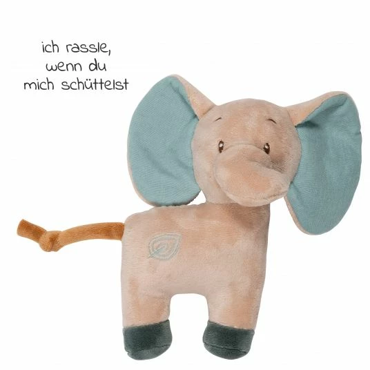Der süße Elefant lädt zum Greifen und Bewegen ein, während die Geräusche der Rassel das Gehör des jungen Entdeckers schulen. Die Rassel lässt sich von kleinen Kinderhänden sehr gut halten und ist mit ihrer praktischen Größe von 19 cm auch unterwegs eine tolle Beschäftigung für Dein Baby. Flauschig weicher Stoff und ein knuffiges Design machen das Rüsseltier zu einer süßen Geschenkidee.