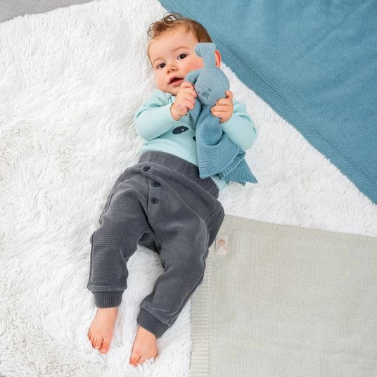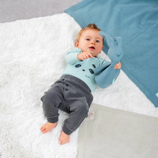 Das graublaue Schmusetuch Lapidou Hase von Nattou ist ein kuschelig weicher Spielfreund, aber auch ein kleiner Tröster in der Nacht. Das niedliche Häschen aus extra weichem Strick-Stoff lädt zum Schnuffeln und Schmusen ein. Der Hase kann auch prima als Fingerpuppe genutzt und so mit ihm Gute-Nacht-Geschichten lebendig gemacht werden.