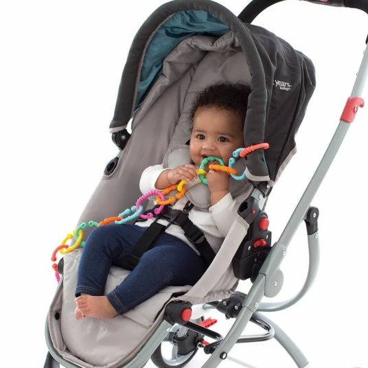 The 24-piece Loopy Links pram chain from Playgro is a practical and versatile toy. The flexible rings can be easily bent up and universally attached to prams or baby car seats. The 24 coloured rings can thus be connected to each other as desired. You can now attach toys to the chain so that they are no longer lost when you’re on the move and are still always at your child’s fingertips. But even without a toy attached, your child will love the chain. The rings can also be used as teething rings and, with their different structures, alleviate tooth pain and promote your child’s sense of touch.