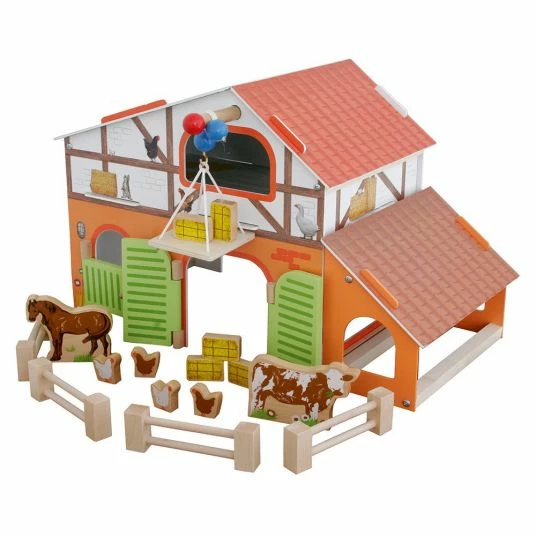 Hier kΓΆnnen kleine Leute prima den Alltag auf dem Bauernhof nachspielen. Γber einen Kran mit Plattform werden Kuh, Pferd und HΓΌhner stΓ€ndig mit frischem Stroh versorgt. Γbernachten kΓΆnnen die Tiere im Stall im Untergeschoss, dessen SchwingtΓΌren sich leicht durch kleine KinderhΓ€nde schlieΓen und ΓΆffnen lassen. TagsΓΌber dΓΌrfen die Bauernhof-Bewohner auf die Weide. Ein 4-teiliger Zaun sorgt dafΓΌr; dass niemand ausbΓΌchst.
