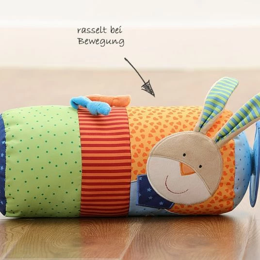 The funny Active crawling role Rabbit by Sigikid brings a lot of fun into your home. As your baby becomes more active and starts to crawl, the role will give him a special incentive. The soft material is colourful and provided with funny patterns. There is also a lot to discover: rattle, crackling foil, mirrors and funny ears, as well as ribbons to feel and pull. The active roll is perfect for crawling behind and supporting. You can wash them comfortably at 30° C in the machine.