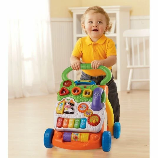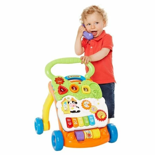 The Play and baby walker in orange from Vtech has lots of surprises and fun for your offspring. On the one hand, your child can train running and standing by using the trolley as a practical support, and on the other hand it is important to discover the fun game functions. There are luminous shapes to plug on, colourful music buttons, rotating rollers and gears. In addition, a detachable telephone receiver and a funny cow button. The trolley is equipped with a motion sensor and the speed of the rollers can be adjusted in two stages. He has a sung song and a selection of eleven children’s songs. The corresponding lyrics can be found in the instruction manual.