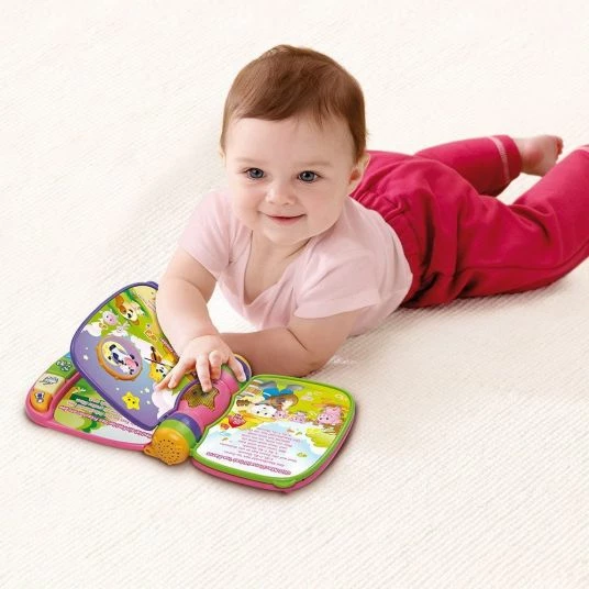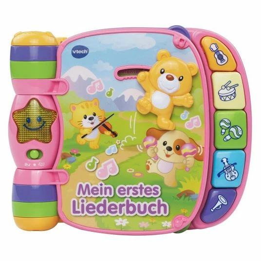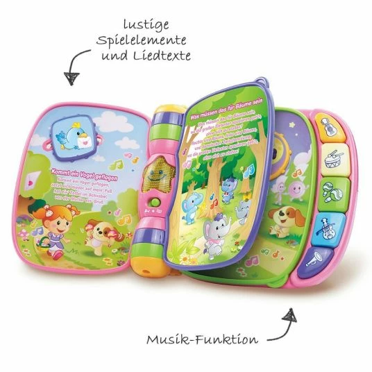 My first songbook in pink by Vtech is just right for little bookworms. The colourful book scores with loving drawings and details. On the individual pages there are different game elements for discovering and learning: for example a star lights up and here a small bear can be moved. Colourful music buttons on the edge trigger great noises. In two playing modes – singing and making music – the songbook plays six sung songs and six children’s melodies. On the seven pages of the book you will find great lyrics that you can sing to your baby to fall asleep or just to sing to him.