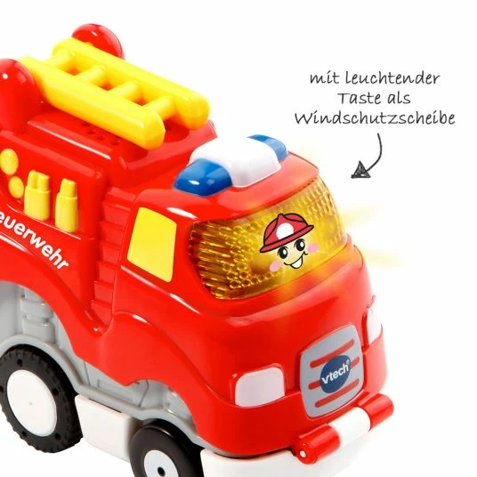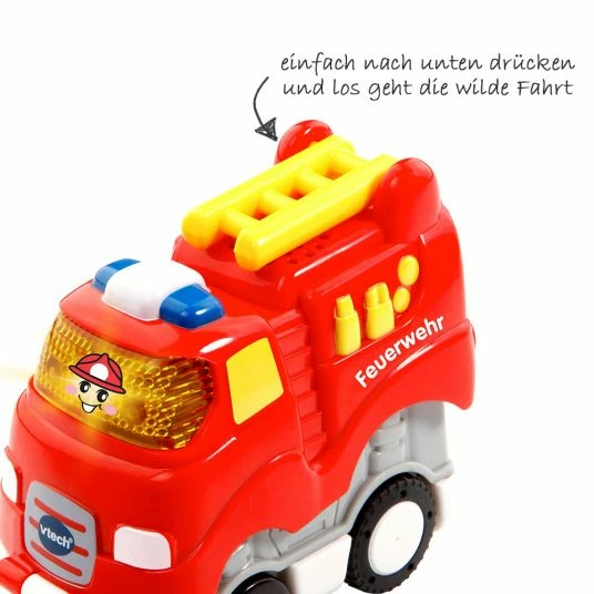 Was kommt dann da auf Dein Kleines mit lautem Tatü Tata zugerauscht. Genau, es ist der selbstfahrende Tut Tut Baby Flitzer von Vtech. Dank seiner Press & Go Technik fährt das Feuerwehrauto von selbst, wenn Dein Kleines das Heck des Fahrzeugs nach unten drückt. Dabei macht es noch lustige Geräusche und spricht fröhliche Sätze. Hinzu kommen noch 10 Kindermelodien und 3 gesungene Lieder. Die Frontscheibe leuchtet und entpuppt sich als Taste die gedrückt werden kann. Werden die Räder bewegt, legt er auch los. Auch kann er auf magische Sensoren von anderen Tut Tut Baby Flitzer Spiel-Sets reagieren welche separat erhältlich sind.